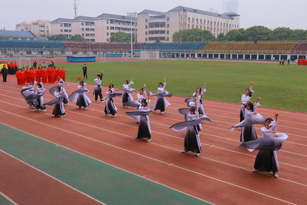 此次比赛分为团体赛和个人赛。团体赛中,历文院代表队在第十九位出场,队员们步伐稳健,沉着冷静,首先以一舞《书简》拉开表演的帷幕,十七位身着水墨舞衣的舞者翩翩起舞,裙摆摇曳生姿,与太极拳柔中蕴刚的动作交相呼应。历文院选择了铿锵有力的乐曲《故宫》作为背景音乐,选手们动作整齐划一、刚柔并济,力求在闪转挪移中诠释出姿势的美感,展现出中国武术文化里的博大精深,传承“阴阳相生,刚柔并济”的太极精神。