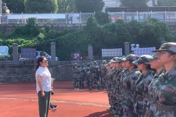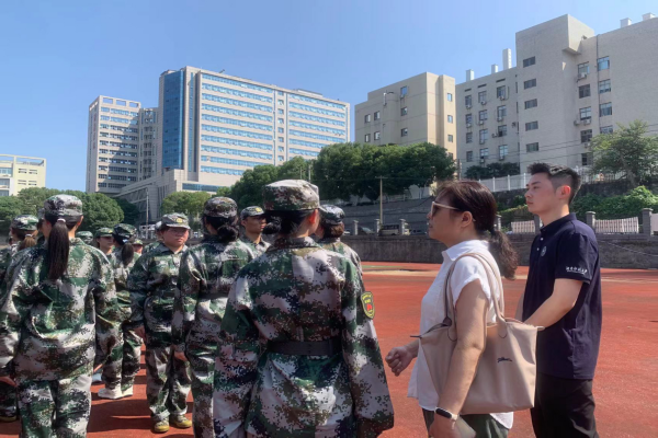 马欣首先巡视了军训现场训练情况。教官列队带领新生向马欣问好,马欣回应并与教官及新生亲切互动。同时,她还向新生传授了站军姿的动作要领。随后,马欣对班导工作作出指导,要求班导多到训练场地巡查,随时掌握学生体能动向并及时作出处理。最后,她再次向新生表达关切,提醒他们身体不适时要及时示意教官及班导,切忌强撑。