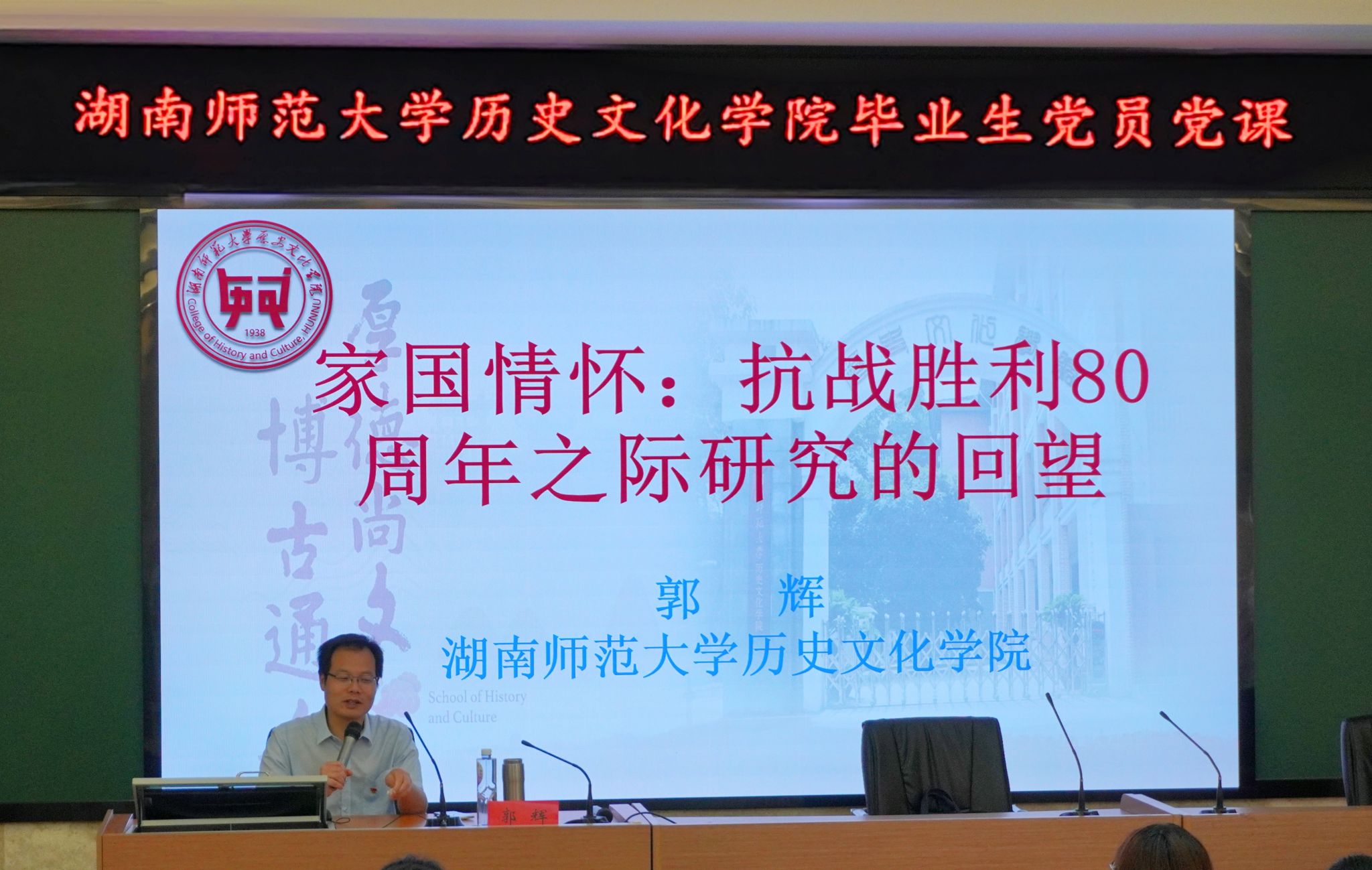 此次党课紧扣抗战胜利80周年,以“家国情怀:抗战胜利80周年之际研究的回望”为主题,从个人对抗战的关注、湖南抗战的全国地位、抗战研究的实地调研三部分展开。郭辉结合自身研究方向与经历,指出“家与国一体”。在阐述湖南抗战的全国地位时,郭辉提及于不同战线默默奉献的科学家群体与游击干部,彰显了湖南抗战的复合力量。同时,郭辉结合在湘阴、影珠山等地实地调研经历,强调“纸上得来终觉浅”,鼓励党员重视实地勘察,从历史中汲取力量,厚植家国情怀。