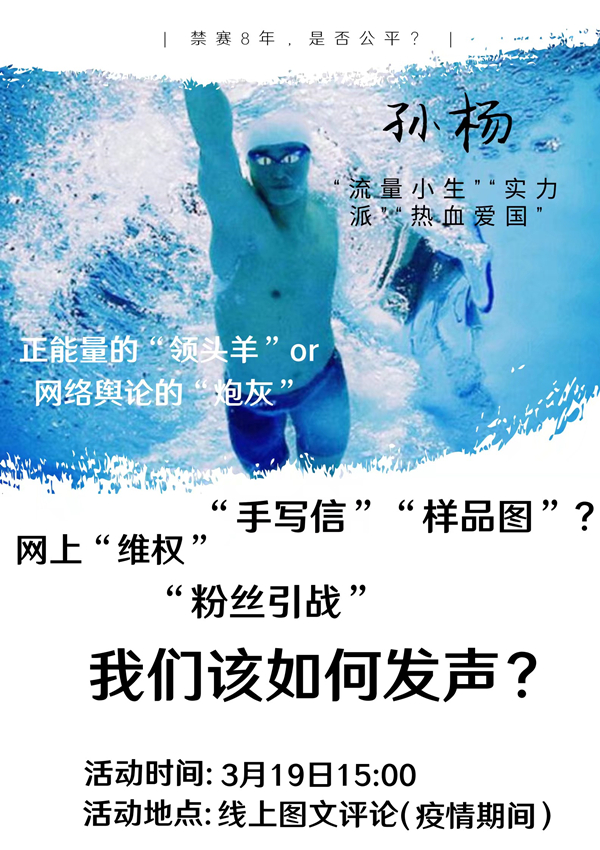 (通讯员 芦金宝)对于一度引起社会关注的孙杨暴力抗检事件,随着国际体育仲裁法庭最终(CAS)宣布,孙杨在兴奋剂测试过程中存在抗检行为,违反了有关“兴奋剂检查”的部分规定,所以即日起对孙杨施行8年禁赛,从而再次引起社会热议。为此,法学院、历文院、外国语学院三院青年评论部在线上以图文评论的方式举行以“孙杨与母暴力抗检,微博法官在线判案”的主题评论沙龙活动。此次评论沙龙由线上举办,三院评论员参加此次活动。