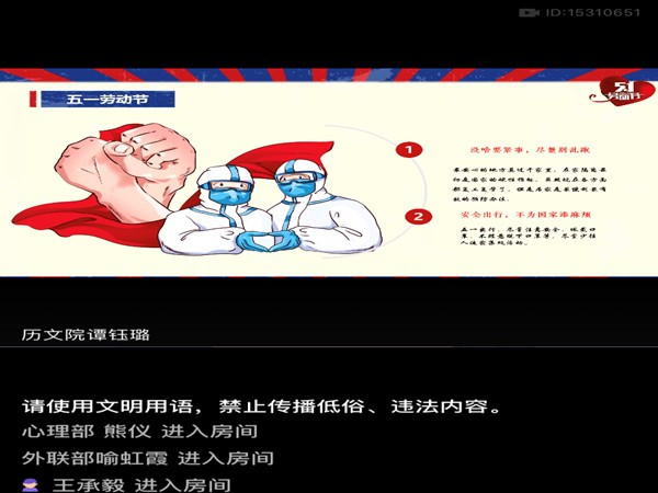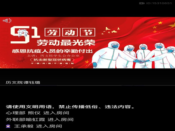 (通讯员 谭钰璐 李妍 陈萍)4月30日中午,sunbet申搏学生会办公室组织开展了以“感恩抗疫劳动者“为主题的线上思想教育活动。出席此次会议的有学生会主席王承毅以及学生会全体成员,由学生会办公室干事谭钰璐主持此次活动。