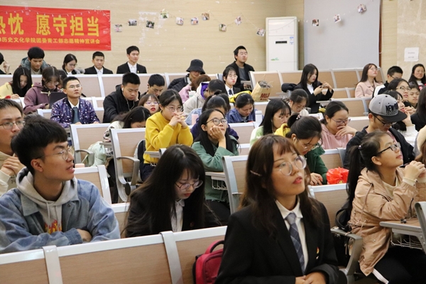 (通讯员 吴越 周子怡)11月22日下午,由历文院团委青工部主办的“志怀热忱,愿守担当”志愿精神宣讲会于历文院203举行。此次宣讲会邀请到院团委书记陈卓君,教授向常水长沙市博物馆志愿者工作负责人肖丽娜作为嘉宾。此次宣讲会的主讲人有肖丽娜、青工部部长张静波、觅美工艺社理事长向红叶、19级历教一班青工委员郑睿智,历文院青工部全体成员和2019级全体学生参加。此次活动由历文院主持队成员许程超,万语烁主持。