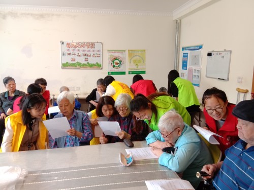 这次团建活动的形式不同以往,前期所开展的活动主要是围绕着志愿者之间进行志愿心得交流、分享老人故事以及自己的收获而展开的。然而此次活动是将老人和志愿者进行对接分组,双方通过游玩一场有关绕口令的热身游戏,使得气氛积极活跃。