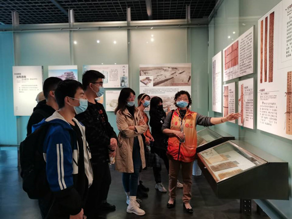 在门口集合完毕后,全体学员佩戴好口罩,保持一米距离测温进场,学员们跟随讲解员的脚步来到陈列馆。陈列馆分为上下两层,其中展厅一层为《文明之路——中国简牍文化展》,该陈列由四部分组成:《三国吴简》《中国简牍》《世界文字载体》和《中国简牍书法》,二层为《湘水流过——湖南地区出土简牍展》。讲解员详细介绍了展厅中简牍背后的故事,也为学员们阐述了其当代价值。其中,还特别介绍了湖南考古发掘和出土文物,使学员们更深刻地认识到湖南地区简牍文物的考古发掘、研究、保护能力。