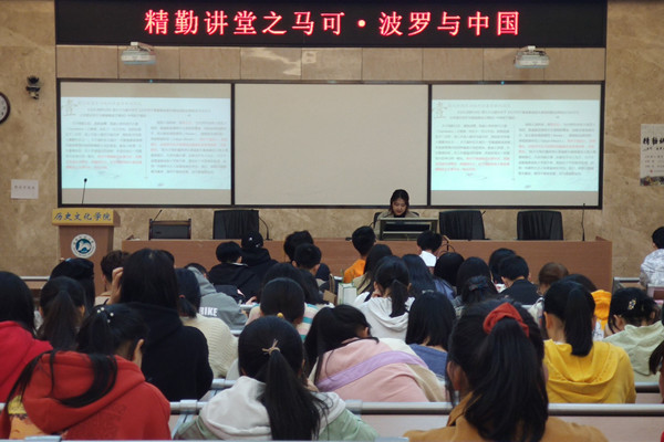 在主持人对主讲人进行简要介绍后,主讲人殷雯便带我们进入了马可·波罗的世界,她引经据典,通过查阅的资料,将中西方论文、名著融会贯通,详细介绍了马可·波罗与中国的故事,叙述蒙元时期的东方叙利亚基督教的汉化、“以儒治国”的转变和发展等内容,对马可·波罗来华时期的儒耶文化进行了总结,并分享自己的心得体会,使同学们了解了课本之外的知识。在讲堂即将进入尾声之际,殷雯还认真回答同学们的问题,进一步加深了同学们对本次讲堂主题的理解。