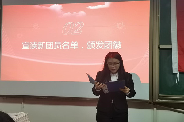 仪式在庄严的团歌中拉开帷幕,景正虹首先宣读新发展团员名单并为新团员佩戴团徽。随后新团员在主持人的带领下手握右拳,面向团旗,团徽进行庄严的宣誓,正式成为光荣的共青团员,开启人生新篇章。宣誓完毕,景正虹发言,表示了对新发展团员的热烈祝贺和殷切期盼,并由衷希望他们能继承和发扬共青团的优良传统。随后,由优秀共青团员代表胡羽风发言,向新发展团员分享了自己的团员心得以及对新团员的嘱托。仪式最后,由新团员代表吴越发言,表示一定时刻牢记共产主义青年团的殷殷嘱托,遵守团的章程,刻苦学习,努力奋斗,争取早日成为社会主义合格的建造者和可靠的接班人。
