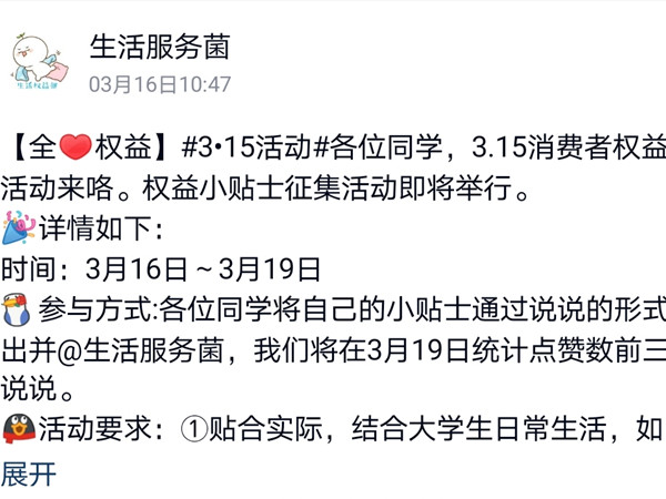 活动过程中,由生活委员向同学们介绍消费者权益的内容以及消费者权益日的发展历程,以及维护自身消费者权益的重要性,并提供了同学们询问维权的具体方法。大家在活动中积极参与讨论并发表自己的不同观点,主讲人对同学们的答案给予了评价和补充,使同学们对消费维权有了进一步认识。线上宣传的工作由生活服务部的成员主持,通过生活权益菌,在权益周内,持续更新与“3.15消费者权益日”相关的内容,主要包括宣传消费者的各项合法权益和维权途径、分析往年维权典型案例、聚焦315晚会等,帮助同学们对“3.15消费者权益日”有了更深层的理解。