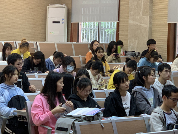 在主持人进行简短的开场介绍后,向常水介绍了大赛的基本概况,包括:线上线下两项赛事,各项赛事时间节点及各项组别报名所需要的条件约束。随后,向常水通过介绍在2019年“建行杯”第五届“互联网+”大赛中,荣获高教主赛道创意组三等奖的王大勇、张慧敏团队的《食有方:中小社区新型健康服务商》和荣获校三等奖曾臻、张鑫团队的《宗祠网——中国第一家宗祠信息服务平台》,向同学们分享参赛经验,为同学们提供范例。在最后的提问环节中,同学们更是踊跃提问,向常水耐心解答,为每一位想要参加大赛的同学提供建议和帮助。