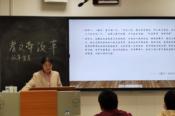 赛前,钟声组织各评委进行了一次评委会议,核对赛事流程,并商定评分细则等事宜。此次比赛以10分钟微课教学的形式进行,包括教学设计,多媒体课件制作和片段教学,要求每位选手在10分钟内借助幻灯片完成授课,同时要在黑板上对课堂要点进行板书,评委老师根据选手的讲课内容,讲课形式,形象气质和板书进行综合评分。参赛学生的授课内容丰富,从古到今,从国内到国外,从政治到经济、文化,其选题视角各异,讲课内容旁征博引。