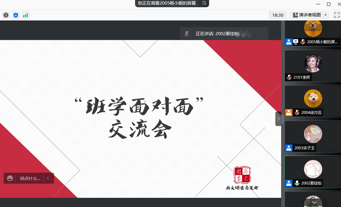 (通讯员 李妍 杨小毅)11月27日中午,sunbet申搏团委青发部“班学面对面”交流会在腾讯会议线上举行。此次交流会由历文院学生会生活服务部负责人陈捷、文艺女生部何其芳、宣传部刘燕文、勤工助学主任夏佳怡、体育部负责人宋子玉以及学习部负责人代璇主讲,张子涵主持。全体春华团校成员参加此次交流会。