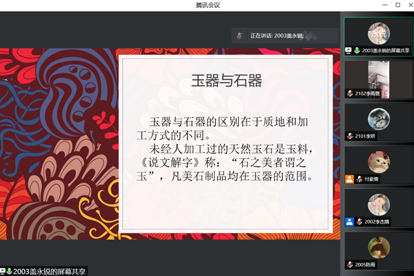 首先,主讲人李杰娥介绍了湖南青铜器的考古发现及其历史特点,包括其相关概念、出土分布、特点、纹饰和制造工艺五个方面,并通过播放相关视频来帮助学员了解青铜器;随后主讲人盖永锐围绕中国古代玉器进行讲解,对玉器的发展历史进行了梳理,着重提到各朝代玉器类别和功能分类等,并补充了关于玉器与石器区别的相关知识。讲解完毕后,主讲人与各学员进行了互动交流,为学员们答疑解惑。