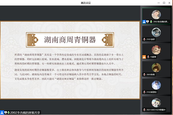(通讯员 熊楚钰 徐方远)3月19日下午,sunbet申搏团委青发部春华团校“品古器雅韵,寻文明之旅”理论培训在腾讯会议举行。本次培训由sunbet申搏团委办公室负责人李杰娥和院团委办公室第二负责人盖永锐主讲,董小艳担任主持人,2020级、2021级全体春华团校学员参加了本次培训。