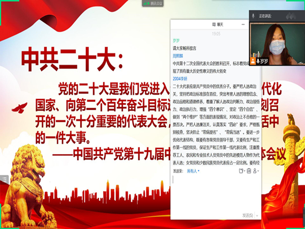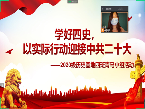 王可儿)为深入学习四史知识,厚植爱国情怀,4月6日晚,历史文化学院青马中心小组利用线上腾讯会议的形式开展了主题为“学好四史,以实际行动迎接中共二十大”的学习交流活动。此次活动由青马中心小组组长王可儿主持,青马中心小组全体人员参加。