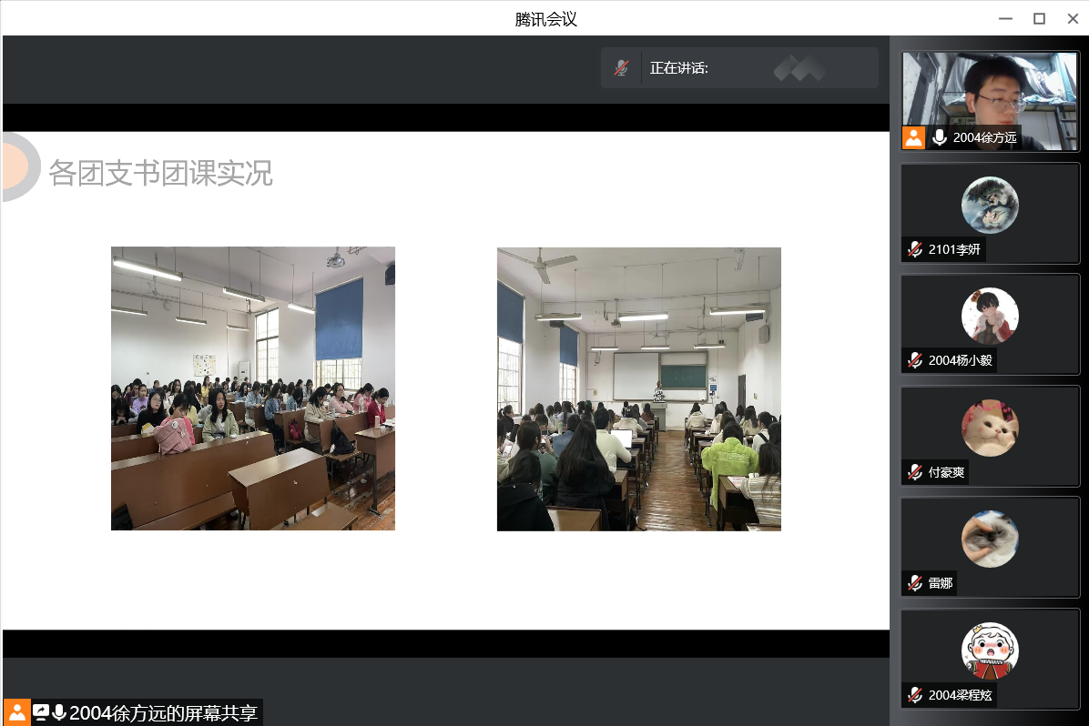 会议中徐方远系统总结了团课期间青发部对各班团支部团课指导的基本情况,表达了对各班团支部在坚持积极响应上级疫情防控要求的同时有序改善工作的充分肯定,并指出了期间所存在的不足,随后围绕如何合理有效解决相关问题与各班组织委员进行了沟通交流,与各班组委通力合作,开辟了多条可行性较强的路径。最后徐方远对此次会议进行总结,并重申了细致耐心推进相关工作的重要性,对持续提升未来相关工作质量进行了展望。