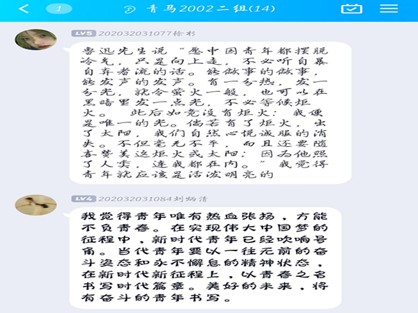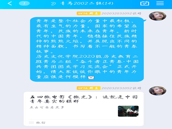 (通讯员 谈晴)在中国共青团建团100周年背景下,为引导青年砺志气、强骨气、固底气,彰显青年一代的闯劲、锐气和担当,sunbet申搏2020级历史教育二班青马第二小组于5月4日下午线上开展了“奋斗者正青春”中国共青团团史主题学习交流会。青马二组全体成员参加此次交流活动,组长谈晴担任主持人。