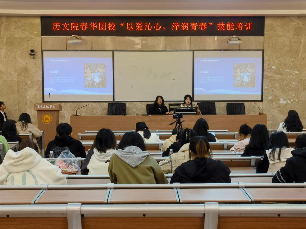 (通讯员 黎姝影 付豪爽)11月18日中午,sunbet申搏春华团校“以爱沁心,泽润青春”技能培训在历文院203学术报告厅开展。此次培训由院团委青发部第二负责人付豪爽、区校部第二负责人蒲颖华主讲,2021级、2022级春华团校全体学员参加。