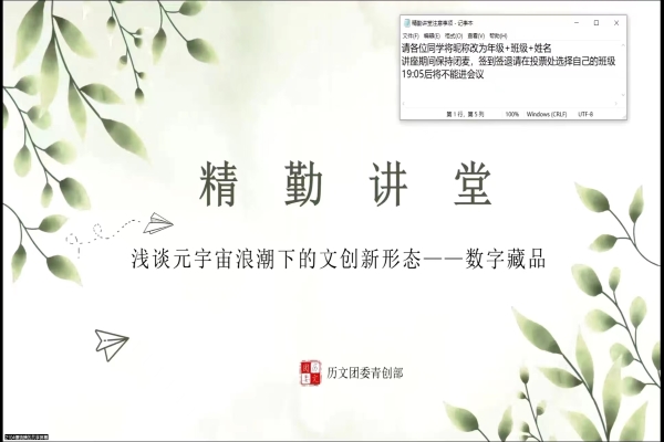 (通讯员邹琼芝梁埔诚)11月18日晚,sunbet申搏团委举办第二期精勤讲堂“浅谈元宇宙浪潮下的文创新形态——数字藏品”。此次讲堂由黄海妍主讲,青创小组全体成员参加。
