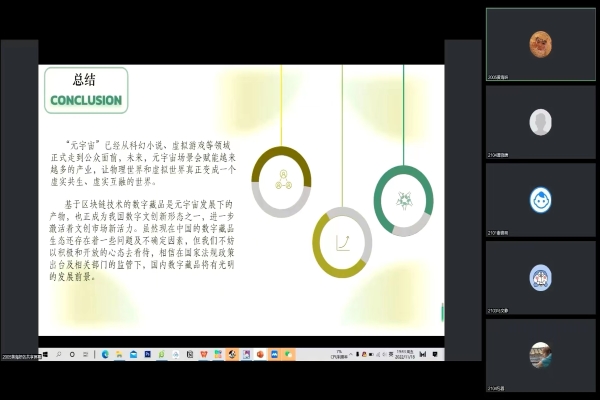 黄海妍以文创新型态数字藏品为中心,围绕其基本概念、与元宇宙之间的联系、流行的原因、意义所在展开论述,并且结合数字文创藏品当前存在的问题,提出了进一步激活文创市场活力的发展建议。在概念引入方面,黄海妍介绍了“元宇宙”和“数字藏品”的缘起,概括总结数字藏品和元宇宙之间的关系,即数字藏品是元宇宙发展下的产物。在原因分析方面,她以博物馆推出的数字文创藏品为例,向同学们展示了具体的藏品样式及其运作方式。在意义归纳方面,她从传统实体文创发展和当今市场需求方面进行总结。在发展建议方面,她提出要增强文创产品竞争力以打开二级市场,也需要合理的监管政策以保障产业的良性发展。