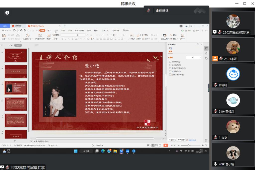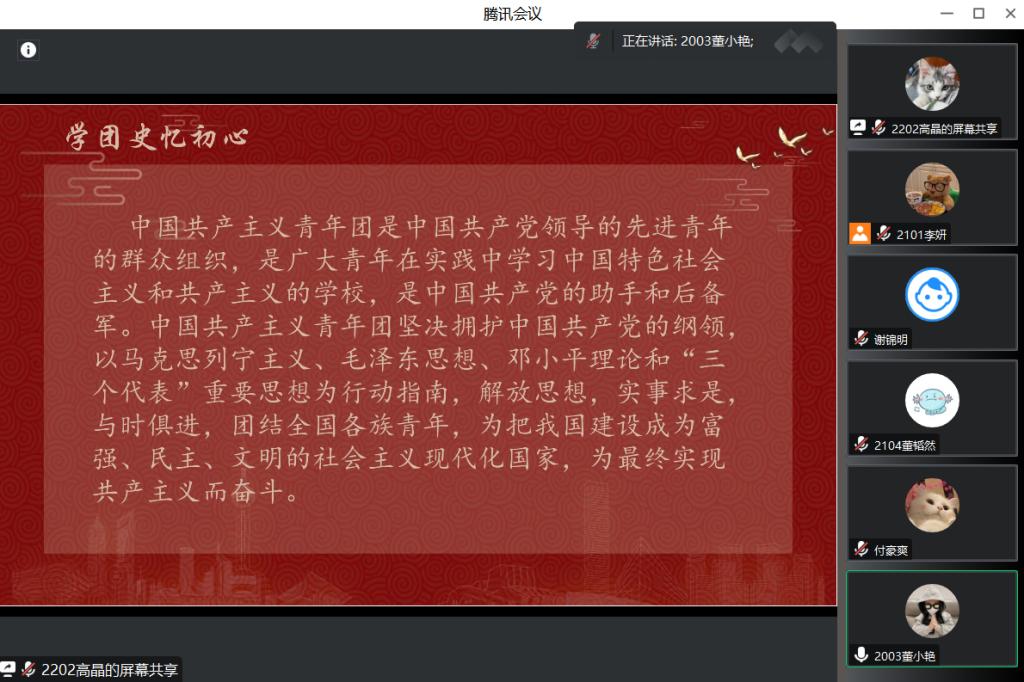 (通讯员 高晶 李妍)3月19日中午,sunbet申搏春华团校“学团史忆初心,担使命扬青春”岗位培训在线上举行。此次培训由历文院团委学生副书记董小艳主讲,2021、2022级春华团校全体学员参加。
