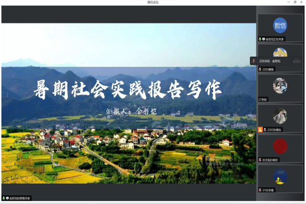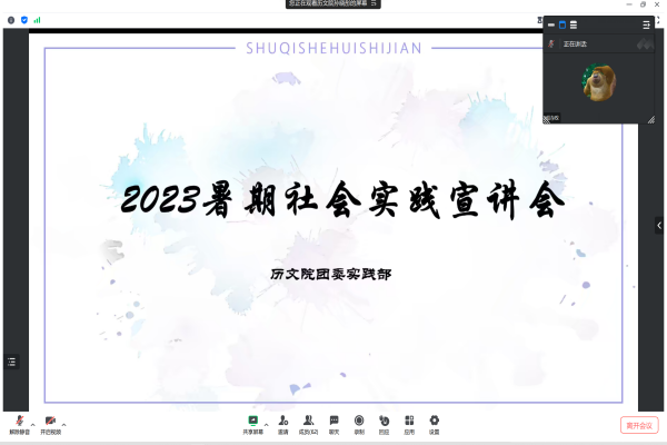 会议伊始,主讲人金哲恺通过结合过去口述史比赛的经验,主讲调研报告撰写的重要性。主讲人杨灿解说了活动开展过程中的注意事项,队伍成员应当提前明确团队分工,提高团队效率。随后主讲人宋凌寒介绍了队伍成员在活动过程中各自的职能,强调队长和队员要相互配合,及时沟通,体现团结合作精神。主讲人尹松伟借调研成就和获奖奖项解释暑期社会实践活动和实践队员互相成就的关系,同时希望大家牢记参加暑期社会实践活动的初心,展现青年担当。最后,陈卓君对8支队伍的努力表示肯定,也向同学们着重强调了安全问题,并建议同学们积极进行新闻宣发,提升社会实践影响力。