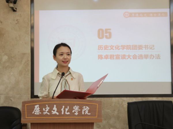 陈卓君作候选人及代表资格审查报告、提案工作报告并宣读大会选举办法。新一届团学组织候选人从竞选优势、工作回顾、未来规划等方面进行竞选演讲。参会团员学生代表对候选人进行投票表决。竞选结束后,董小艳、刘燕文、吴诗仪和李怡分别作述职报告。