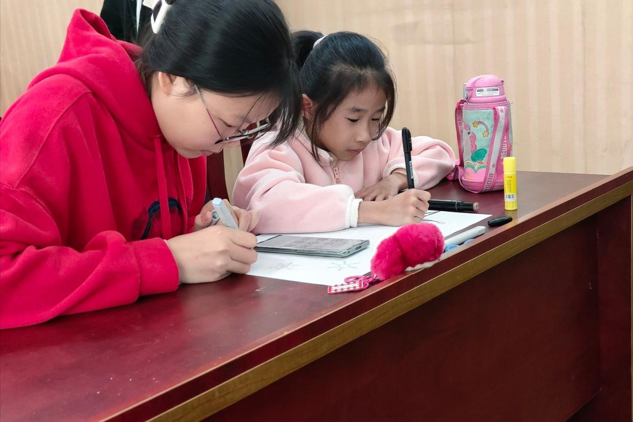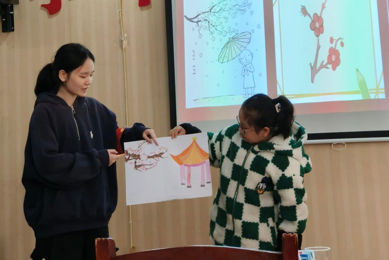 活动伊始,主讲人通过PPT向小朋友们讲解小雪这一节气的相关知识,让小朋友们了解到小雪节气及其所蕴藏的中华优秀传统文化。志愿者们通过“你划我猜”“趣味诗词”等游戏加深小朋友们对节气知识的理解。此外,志愿者们还带领小朋友们绘制梅花图,并轮流上台进行图画展示,阐述设计理念。活动接近尾声,志愿者们进行合影留念。