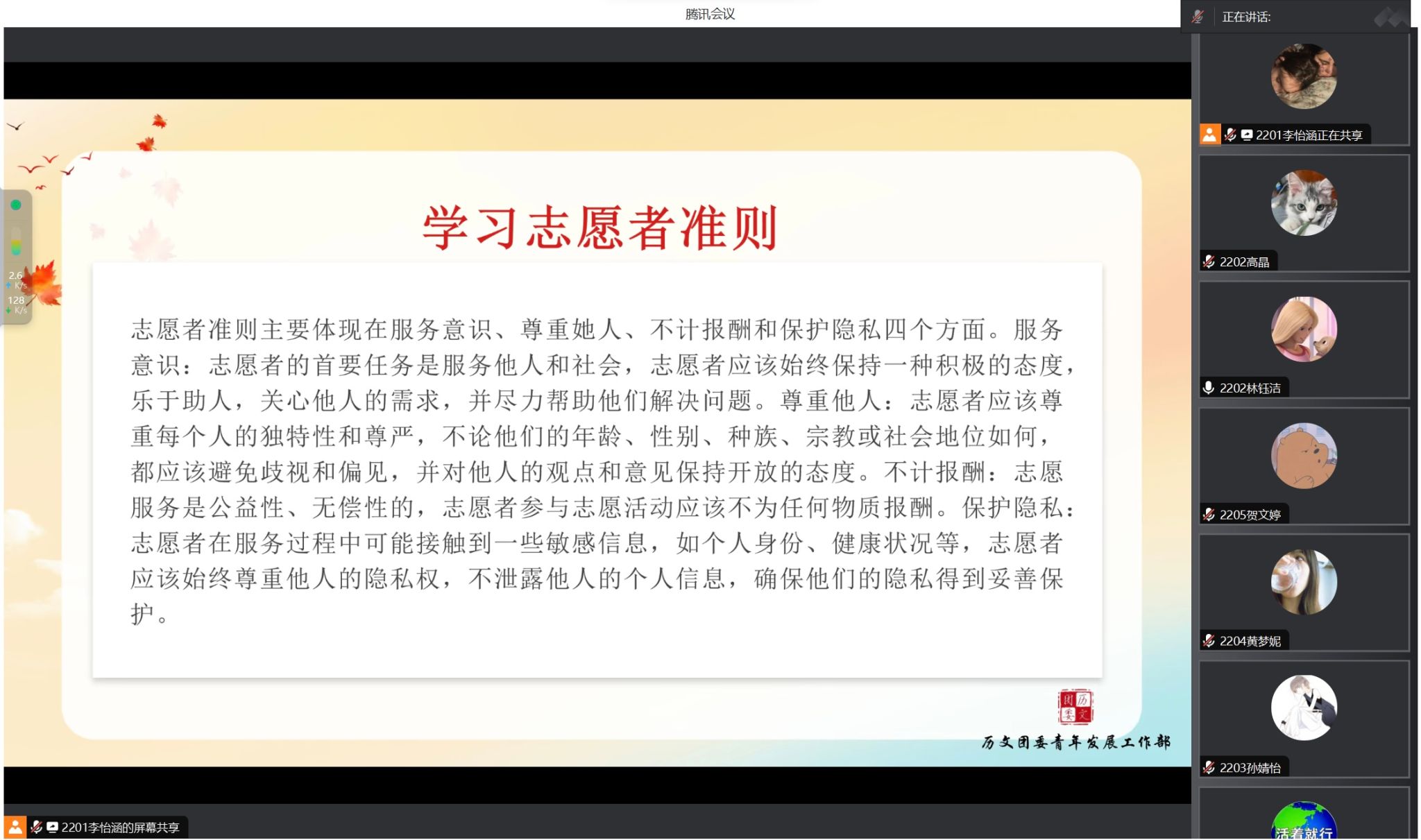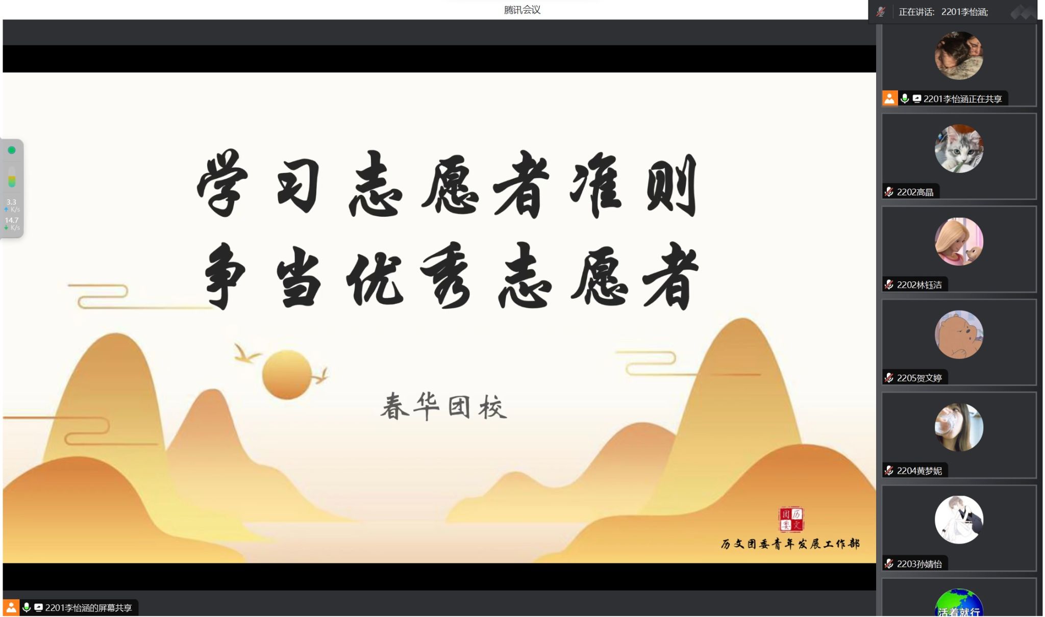 (通讯员 谭薇 李怡涵)3月16日晚,sunbet申搏春华团校“学习志愿者准则,争当优秀志愿者”岗位培训于线上开展。此次培训由历文院团委区校部负责人林钰洁,第二负责人叶玲、李清月主讲,春华团校全体学员参加。