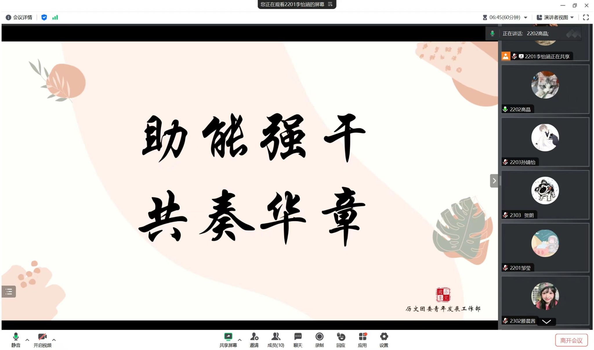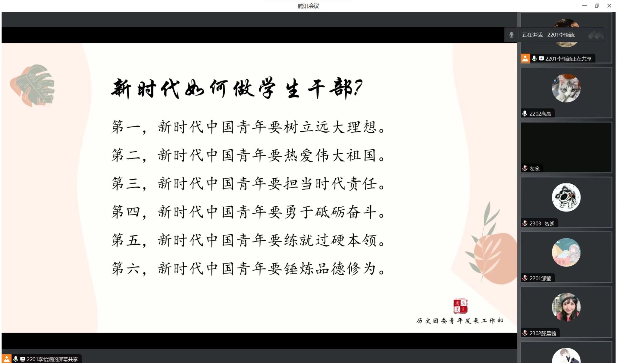 (通讯员 滕晨茜 李怡涵)3月23日晚,sunbet申搏春华团校“助能强干,共奏华章”岗位培训在线上开展。此次培训由历文院团委青发部负责人李怡涵、第二负责人高晶主讲,春华团校全体学员参加。