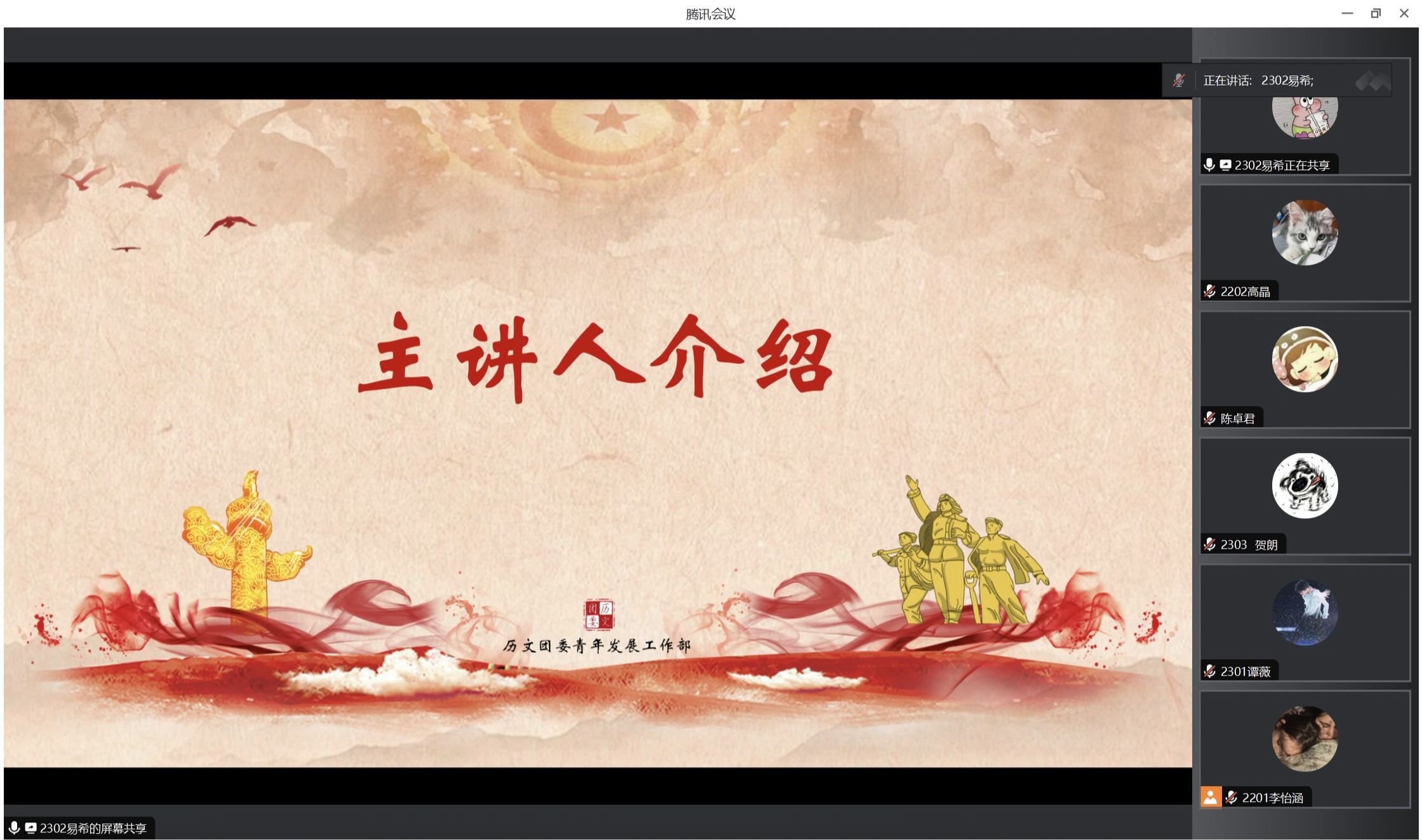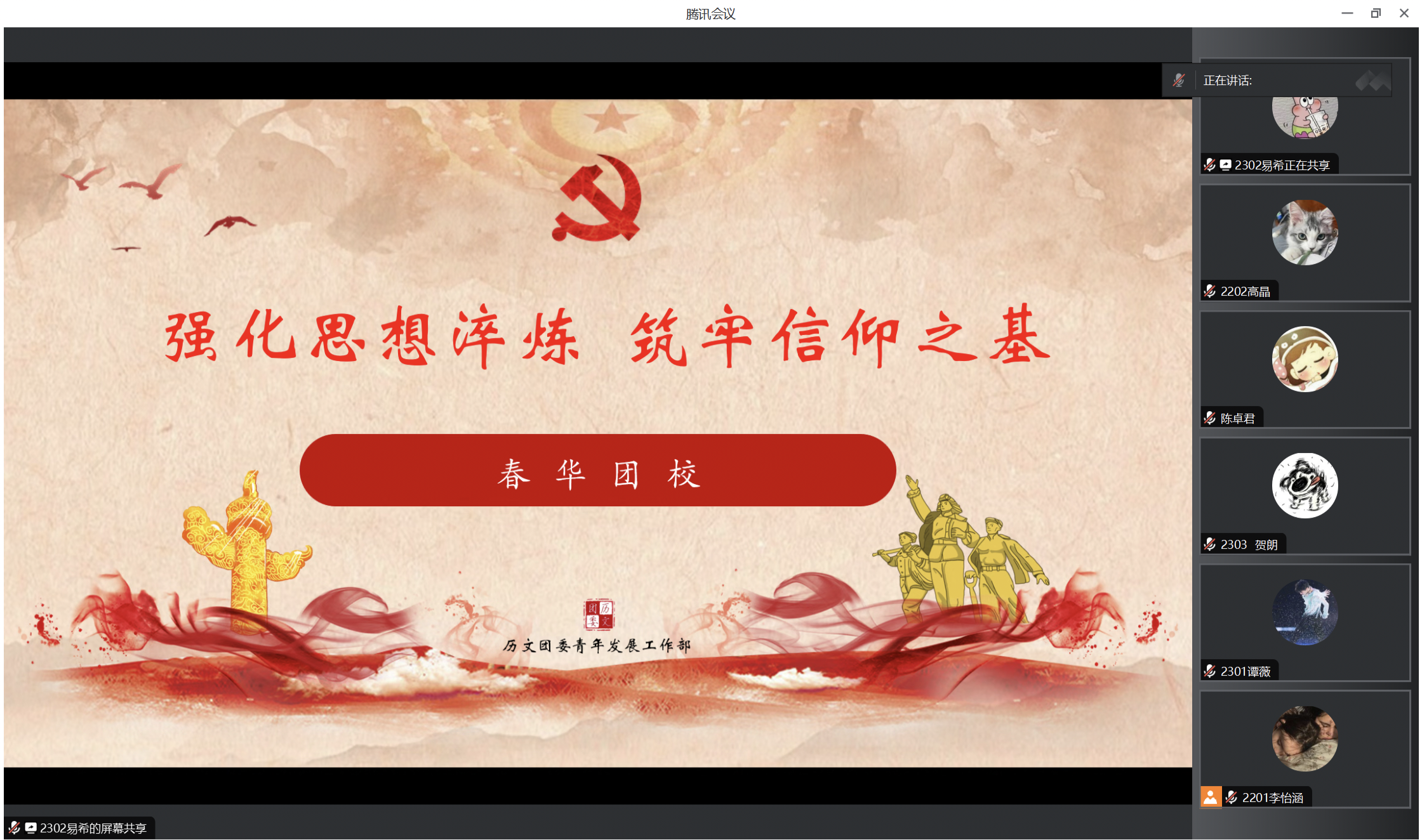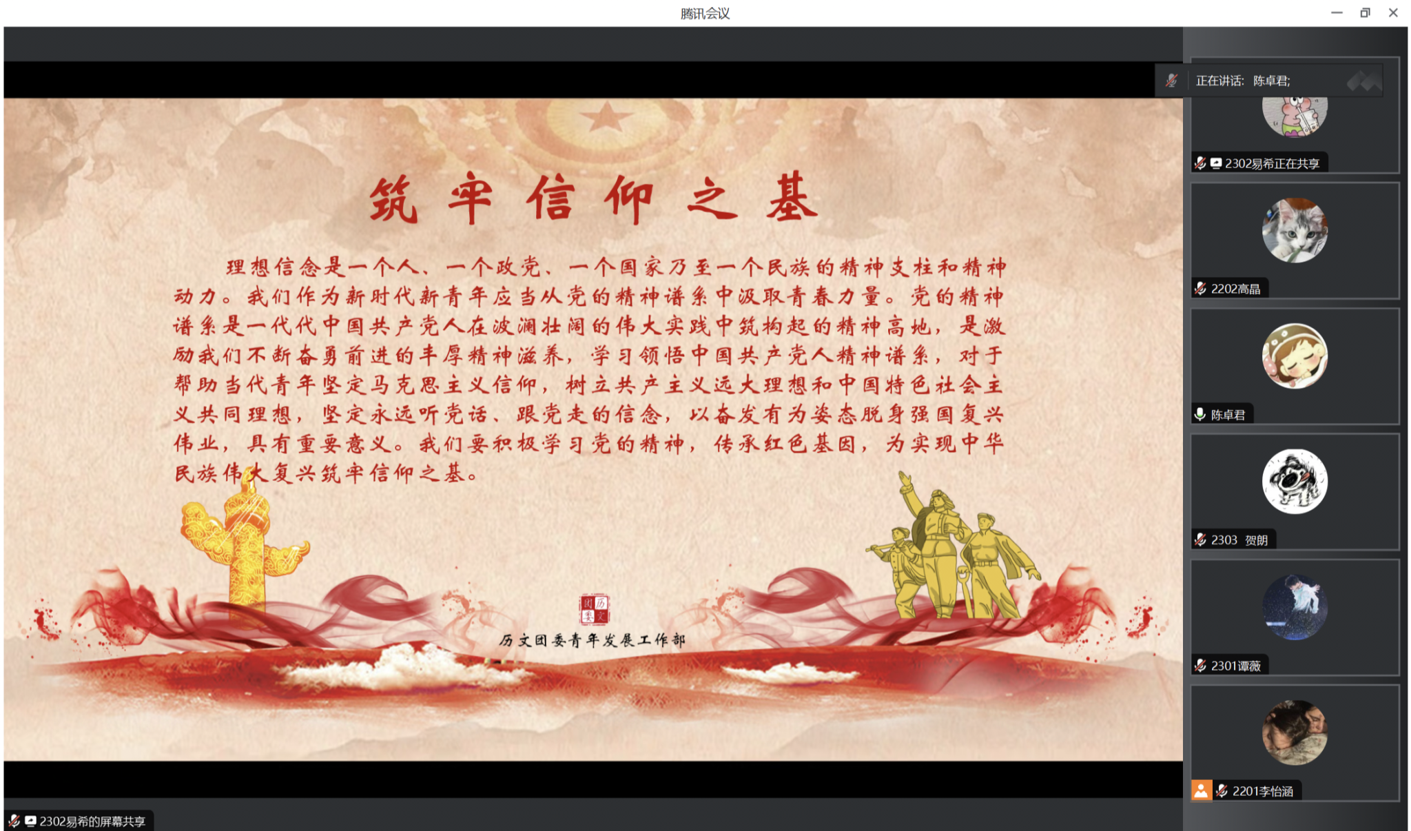 4月4日中午,sunbet申搏春华团校“强化思想淬炼,筑牢信仰之基”理论培训在线上开展。此次培训由历文院团委书记陈卓君主讲,春华团校全体学员参加。