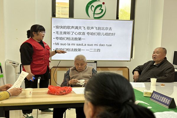 活动伊始,志愿者与社区老人进行初步交流,了解了他们的情况。随后志愿者为老人发放歌词本,带领他们学唱歌曲,练习娴熟之后加入简单的手势动作。中场休息时,志愿者陪伴老人聊天,询问老人的生活情况,并带领老人玩趣味游戏,老人根据志愿者的口令指向相应的五官,全神贯注投入游戏中。活动最后,志愿者与老人一同合唱练习的歌曲并合影留念。社区工作人员表示老人十分享受参与的过程,并对志愿者的服务给予了充分肯定。