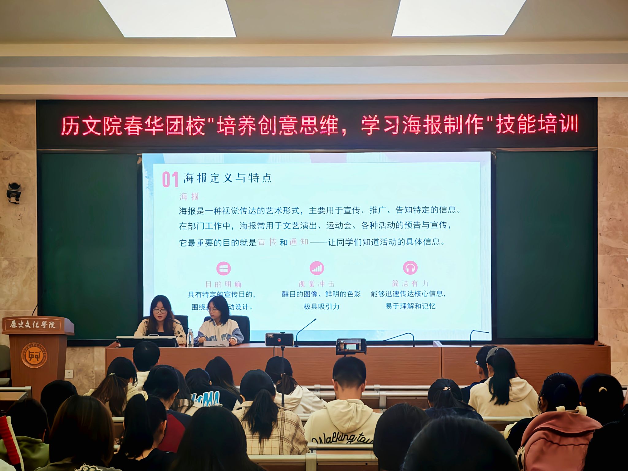 (通讯员韩叙易希)11月15日中午,sunbet申搏春华团校于历文院203学术报告厅开展“培养创意思维,学习海报制作”技能培训。此次培训由历文院团委宣传部负责人李卓颖、宣传部第二负责人孟湘主讲,2023级、2024级春华团校全体学员参加。
