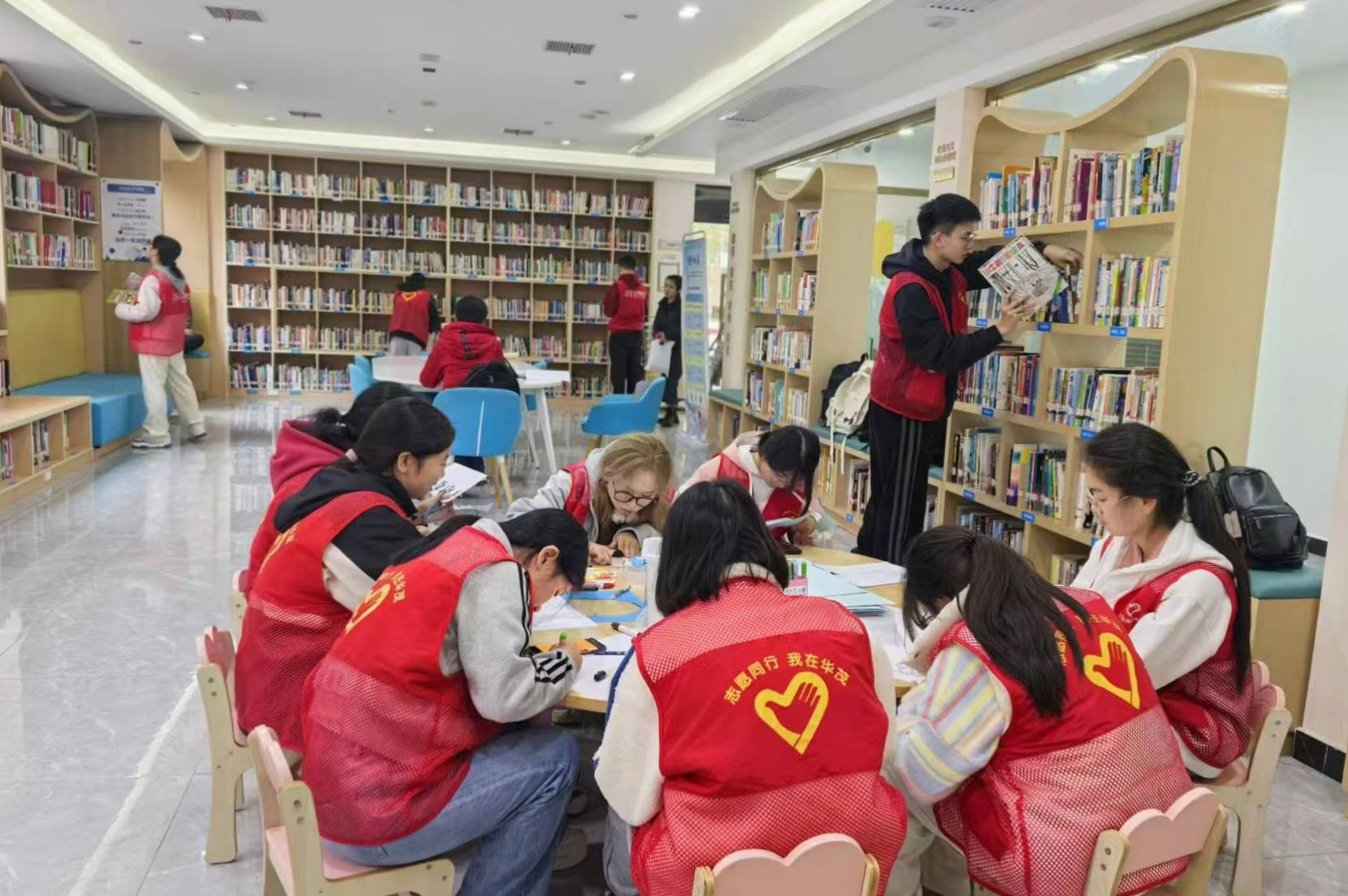 活动伊始,图书馆工作人员为志愿者们讲解图书馆基本工作流程,并将志愿者分为两组,一组志愿者们负责图书整理上架工作,另一组志愿者负责制作环创手工。随后,整理图书的志愿者按照要求将图书上架并摆放整齐;另一组志愿者们围坐在圆桌前,在卡纸上对照参考图进行环卫手工创作。所有志愿者配合默契、分工明确,使得图书摆放井然有序、手工作品创新有趣。活动结束后,志愿者帮助图书馆工作人员打扫活动室和阅读区域,并交流活动心得与体会。