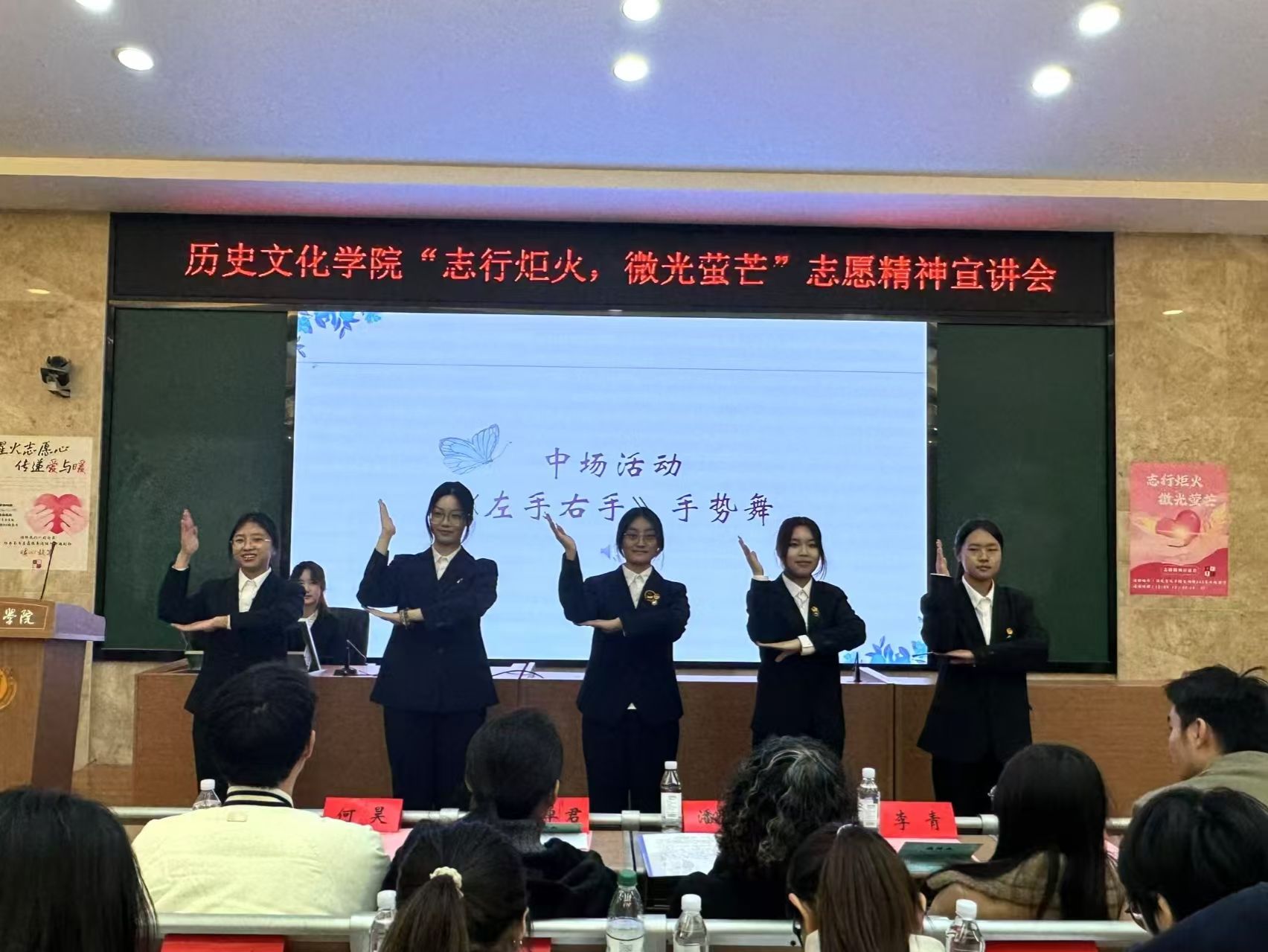 会议伊始,全体起立,奏唱团歌。随后,院团委青工部进行风采展示,合唱歌曲“夜空中最亮的星”和表演手势舞“左手右手”。接着,春秋学社理事长袁艺宣、志愿者代表何祎、长沙市爱福自闭症儿童教育中心负责人潘郁三位主讲人分别以《不啻微茫,造炬成阳》《微光可成炬,大爱映苍穹》《以志愿精神,点亮星星之光》为题,结合自身经历讲述她们对志愿精神的感悟,引导同学们领悟志愿精神的内涵。随后,在志愿分享和互动环节中,同学们分享自身志愿经历,并与主讲人进行问答交流,进一步深化对志愿者精神的认识。最后,陈卓君对此次宣讲会进行点评与总结,她充分肯定三位主讲人的发言,并指出,每一点微小的星火都蕴含着不可忽视的力量,希望同学们秉持志愿精神,参与到更多的志愿服务当中。