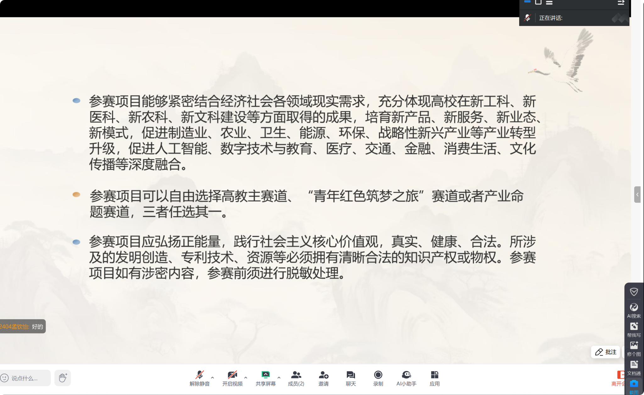 (通讯员 李采宸 游子萱)2月28日下午,sunbet申搏团委青创部于腾讯会议举办中国国际大学生创新大赛宣讲会。此次宣讲会由历文院副教授刘潆檑主讲,院团委书记陈卓君参加,2022、2023级部分学生、2024级全体学生参加。