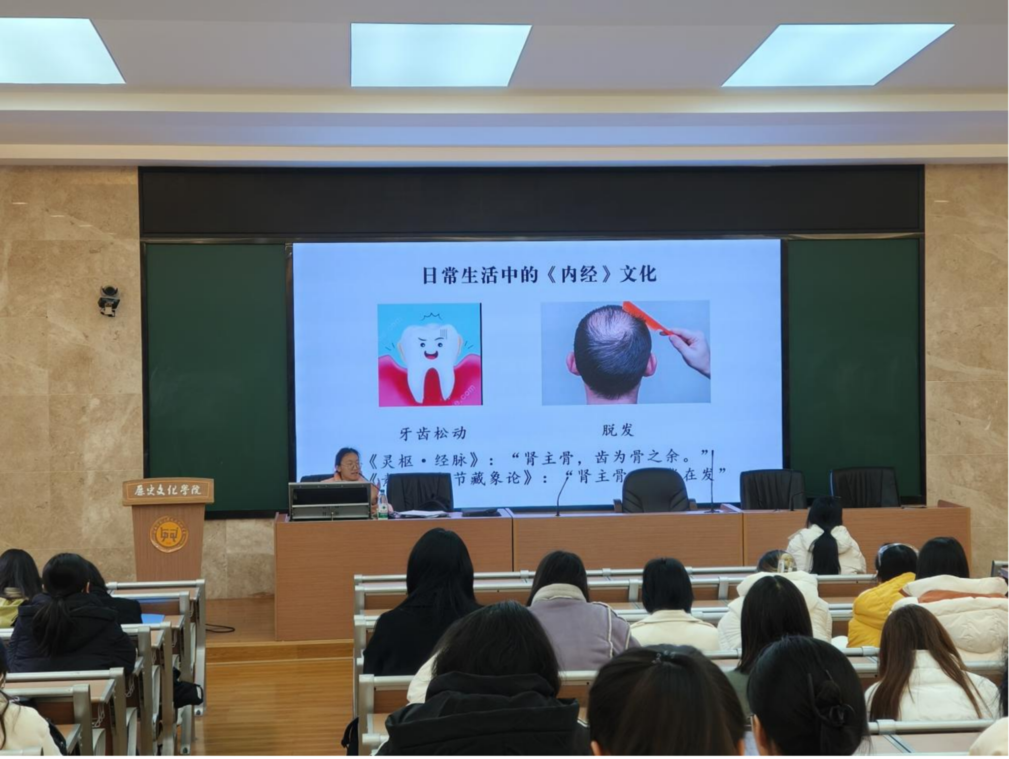 讲座伊始,向柏咨学姐简要介绍了《黄帝内经》这部中医经典著作在中华文化宝库中的重要地位。她指出,《黄帝内经》不仅是一部医学巨著,更是蕴含着丰富哲学思想和养生智慧的典籍,对现代人的健康生活有着深远的指导意义。