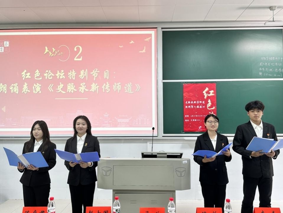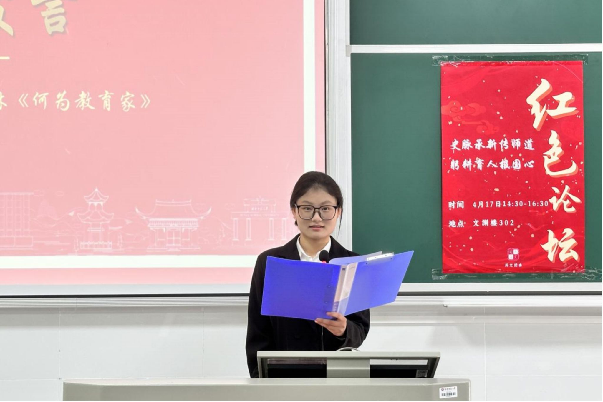 论坛拉开序幕,全场肃立,奏唱国歌。随后,以红色论坛特别节目开场,青年学生上台朗诵《史脉承新传师道》。四位主讲人分别以《传承历史文脉,躬耕育人报国》《在时光的灰烬中播种,守护灰烬深处的余温》《何为教育家》《历史长河奔涌向前,教育强国正当时》为题,结合自身学习生活实践,从教育强国战略的青年视角,分享时事热点、榜样故事、经验感悟,进一步引导大学生理解习近平新时代中国特色社会主义思想及教育强国精神,激励广大青年学子奋发图强,积极进取,为成为新时代优秀青年教师奠定坚实基础。在聆听主讲人们的分享后,观众与主讲人进行问答交流并为支持的主讲人投票。特邀嘉宾赵士国对此次论坛进行点评与总结,他充分肯定四位主讲人的发言,希望同学们关心创新技术与热点时事,强化专业技能知识,积极运用现代化技术提升自身素养。最后,马欣宣布评选结果并颁奖。