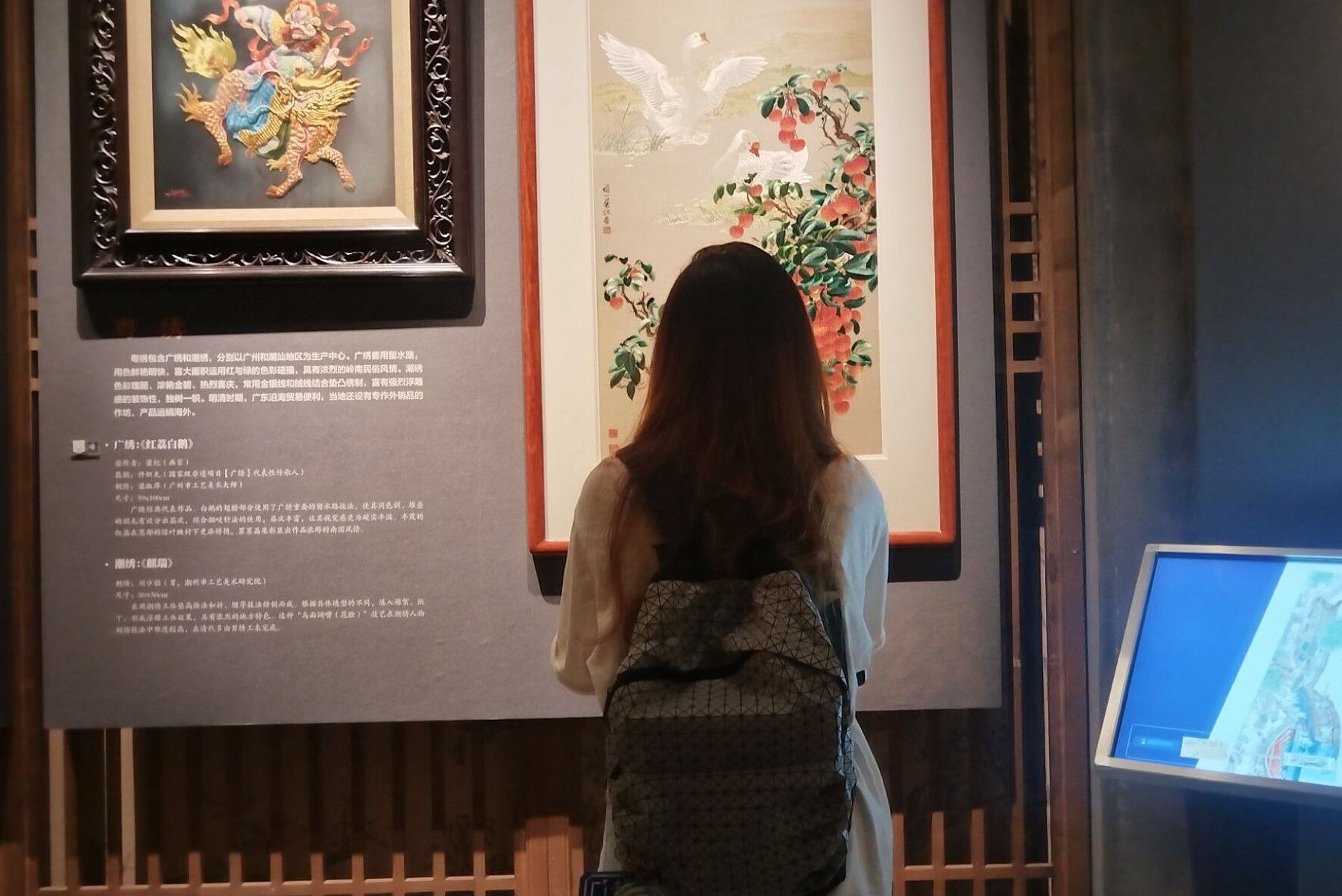 活动伊始,学员们跟随讲解员依次参观了“针尖之源”和“针尖之兴”两大主题展厅。通过观摩战国时期楚绣残片、清代宫廷绣品及现代双面全异绣等代表性展品,学员们系统了解了湘绣从楚汉纹样到当代创新的艺术脉络。随后,学员们以小组形式围绕“传统工艺的活态传承”展开研讨,结合展厅中《狮虎》等经典作品的创作故事,探讨数字化传播、跨界设计等赋能非遗技艺的新路径,深化对湖湘非遗文化的理解。
