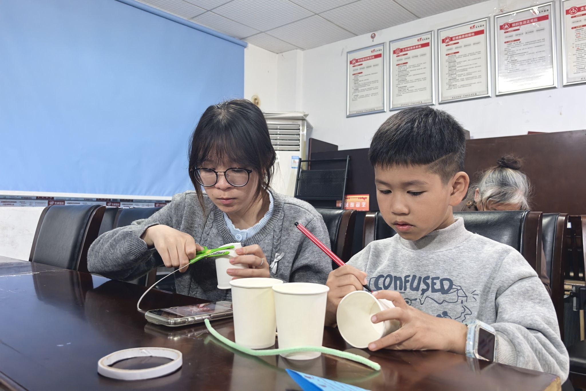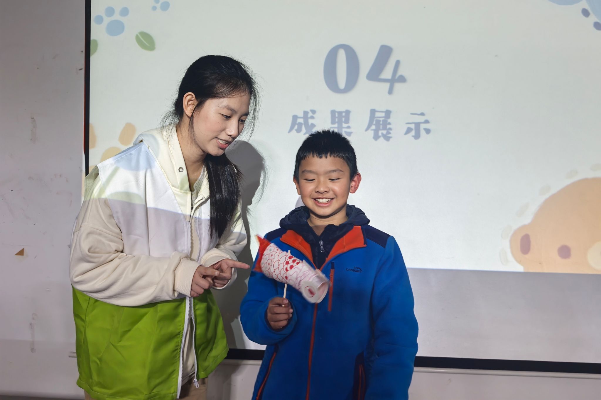 互动环节中,小朋友们通过观察鱼灯的竹编骨架、彩绘纹样与舞动阵型,领会"鱼跃龙门"等寓意。主讲人围绕全运会设置文化拓展问答,让小朋友们探讨鱼灯在体育盛会中的创新应用,展现了传统技艺在现代社会中的多元发展。手工环节,小朋友们在志愿者的协助下,将湖湘纹样绘制于纸杯表面,创作出兼具传统韵味与童趣特色的鱼灯。制作完成后,孩子们依次上台展示并分享设计理念,在实践中加深对非遗鱼灯与湖湘文化的理解。