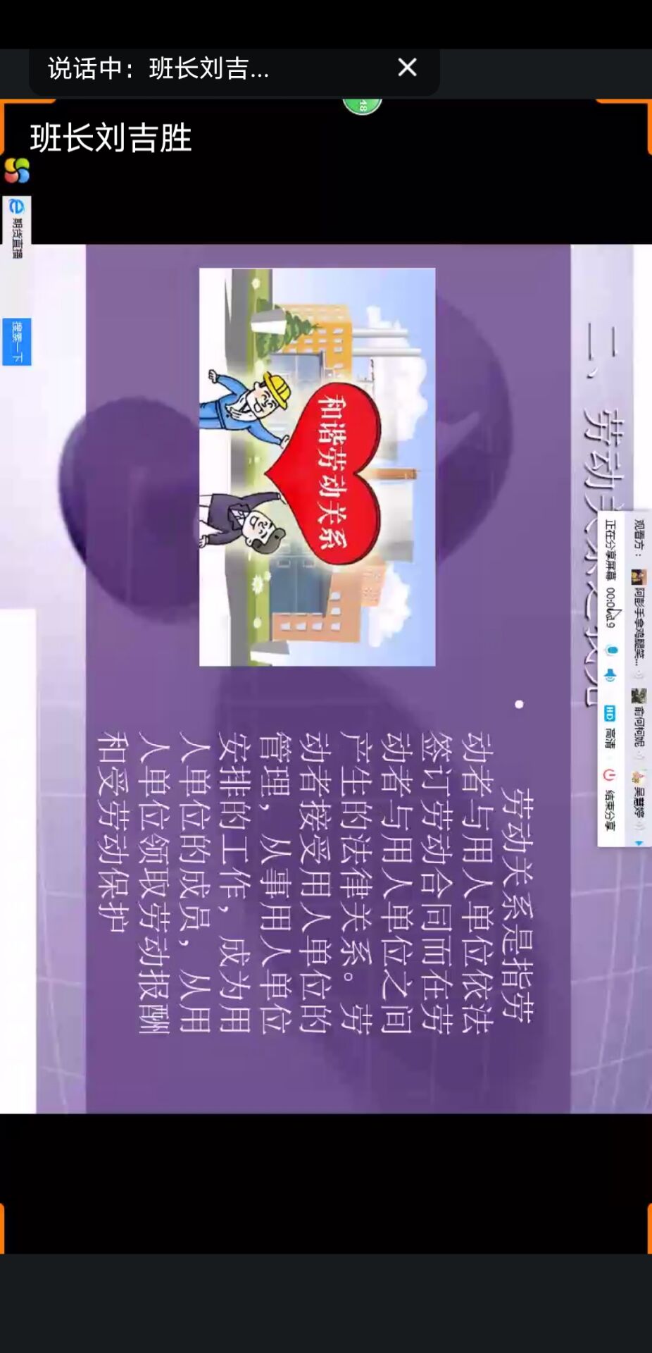 会议伊始,刘吉胜介绍了此次班会的主要内容,包括劳动法律知多少、劳动关系之我见、劳动经济学、劳动对社会发展的意义、劳动对个人发展的意义、劳动与就业的辩证关系等六大部分。会议过程中,刘吉胜同全体同学就每一部分的主题一起进行讨论。