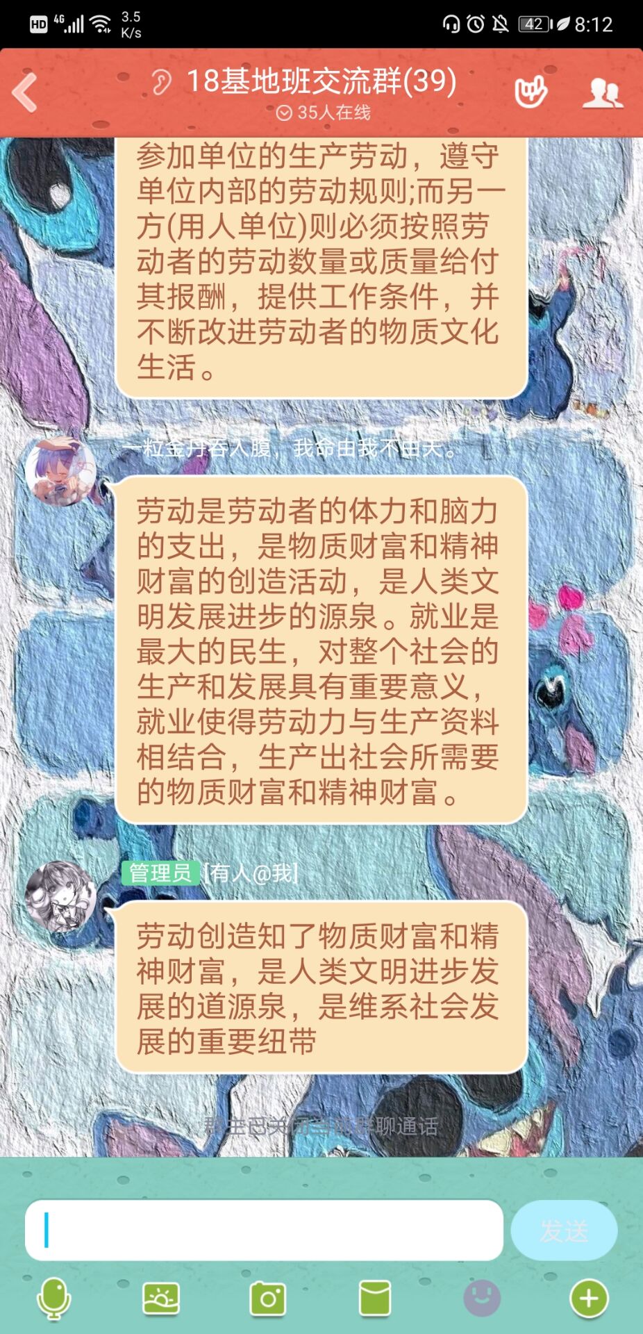 在讨论环节,针对劳动经济学主题,朱灵认为:“在我国经济发展的新形势下,深入研究劳动经济学,能够提高对我国经济发展的认识,达到为经济发展服务,提升经济发展质量,起到促进经济快速增长的目的。”针对劳动对社会发展的意义主题,卢逸提到:“生产劳动对人类社会发展的意义,贯穿于人类社会的始终,生产劳动不断创造出人类所需要的生产资料和生活资料。”会议最后,刘吉胜对全体同学的观点进行了总结,并鼓励全体成员参加“居家劳动”大比拼活动。