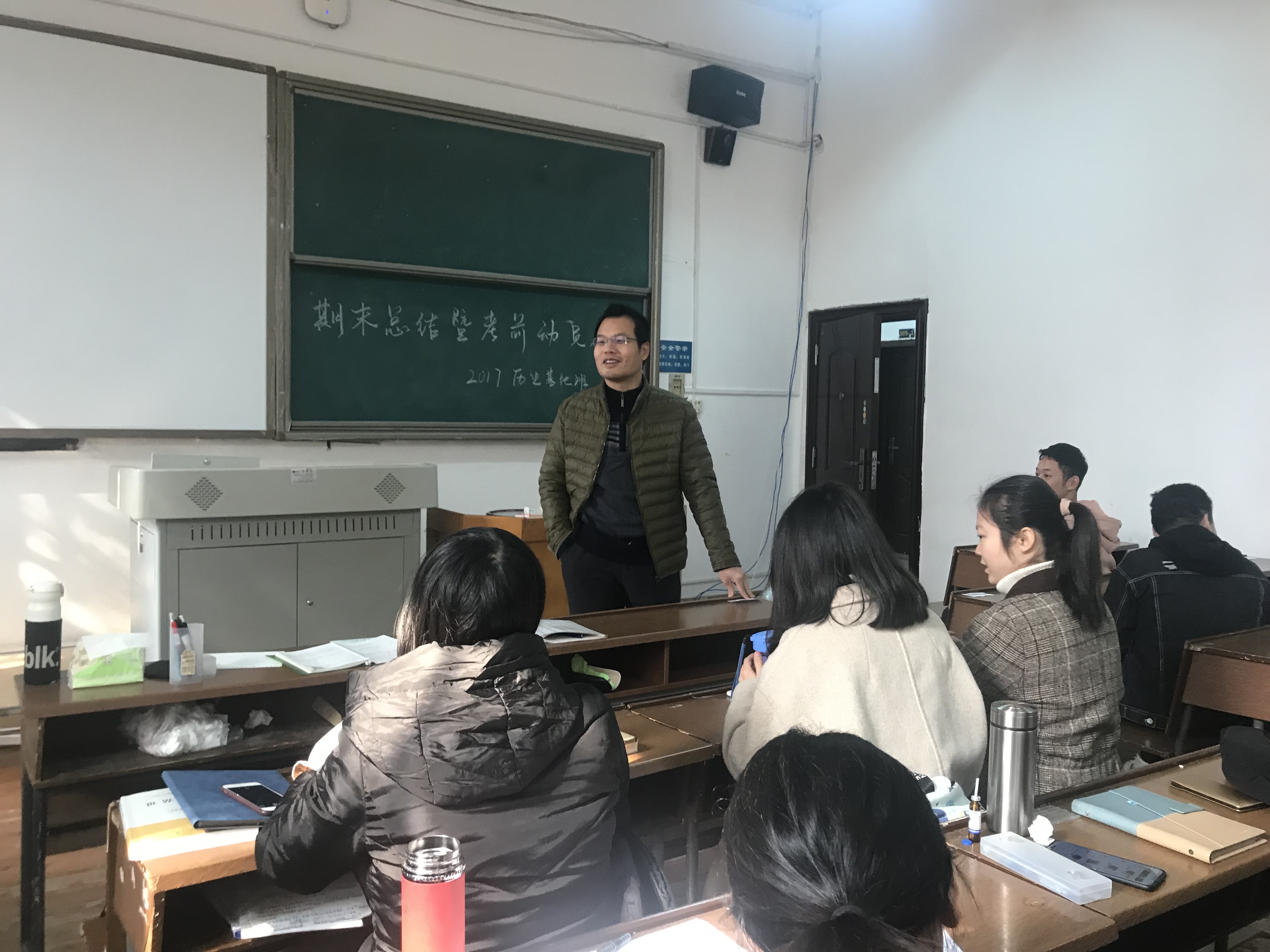 郭辉肯定了17基地班同学本学期的学习状况与成就,并表示基地班在今后的日子里任然需要继续努力 ,提高自我危机意识,不断提高自己;要找准基地班的定位,开始以一个史学工作者的身份来要求自己,适当在科研方面下功夫,做出一定的成果。同时,郭辉以中山大学口述史比赛为例,鼓励基地班同学要多出去走走,提高自己的眼界与见识。最后,郭辉再次强调了考试纪律的问题,并预祝与会人员取得一个好成绩。