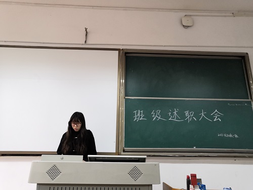 活动过程中,年级宣传委员姜隽姝、班长焦文瑶、班级团支书马一帆、班级组织委员陈金瑞、班级宣传委员舒家丽依次上台,对自己任职期间的各项工作进行了总结并作自我评价,表达了其在这一学年中任职学生干部的感受。同时,由班级成员对她们进行评分。
