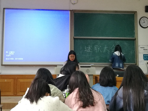 活动伊始,团支书刘杭波介绍了述职大会的开展背景、会议流程、评分方式以及评分标准。活动过程中,班长古扎丽努尔·艾力因事缺席,副班长刘倩影代其述职,刘杭波、组织委员张玥、宣传委员孙玉珊依次上台,从德、能、勤、绩、学五个方面对自己任期内的工作进行总结,反思自身工作上的不足,表达作为学生干部的感受,团支部其他成员进行评分。活动最后,刘杭波进行总结,希望班级成员积极配合班团干部工作,认真对待每一次集体活动。团小组组长收集本组组员的评分表,团支书刘杭波进行汇总。
