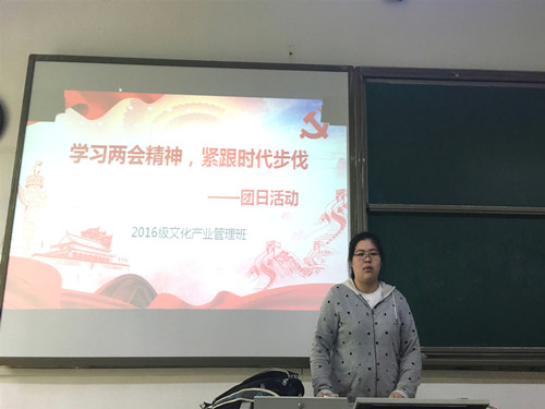 (通讯员 严锦璐)4月17日,sunbet申搏2016级文化产业管理班团支部在院308教室开展了“学习两会精神 紧跟时代步伐”主题团日活动。此次活动与创新创业实践课程相结合,由参观长沙市非物质文化遗产展示馆和室内学习交流会两部分组成。此次活动中的室内活动部分由团支书严锦璐主持,16级文管班团支部全体成员参加,。