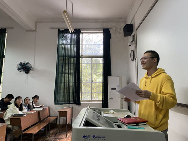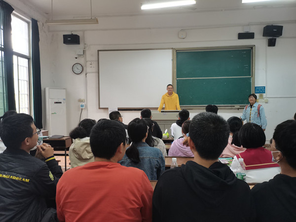 吴鹏程向同学们介绍了自己后,就大学学习与生活对同学们提了一些建设性建议与希冀,希望同学们珍惜短暂的大学时光,不断学习新知识来武装自己,并以自己亲身经历鼓励大家刻苦学习。吴鹏程特别强调了英语学习的重要性,鼓励大家多记单词,提升自己英语水平,此外,吴鹏程还建议同学学习一门第二外语,丰富武装自己。吴鹏程表示,在以后的学习中大家要相互督促,相互学习,共同进步,除了专业知识上的指导,他也很乐意为同学提供各种学习和生活上的帮助,同学们纷纷表示感谢。