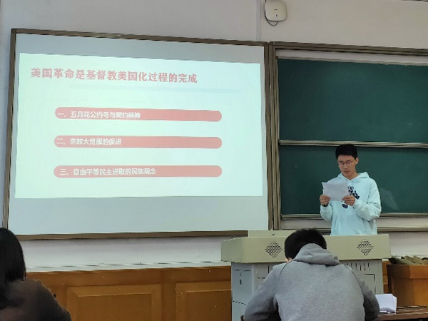 学习委员李讷在班级官方群里公布了小组展示的顺序和主题:刘广宇组“美国革命与印第安人地位变化”、杨卉组“地方主义与美国革命”、李怡然组“自由平等思想与美国革命”、杨贵钦组“基督教文明对美国革命的影响”。各小组的展示主讲人都准备了PPT和主讲稿,并介绍了本组的成员、分工和参考文献,通过图文结合的方式向同学们进行了展示。杨贵钦组还采用了不同的形式-情景演绎,给同学们带来了新的体验。在小组展示结束后,小组的其他成员也进行了相应的补充和答疑,最后,傅老师对此次的讨论进行了点评与总结。