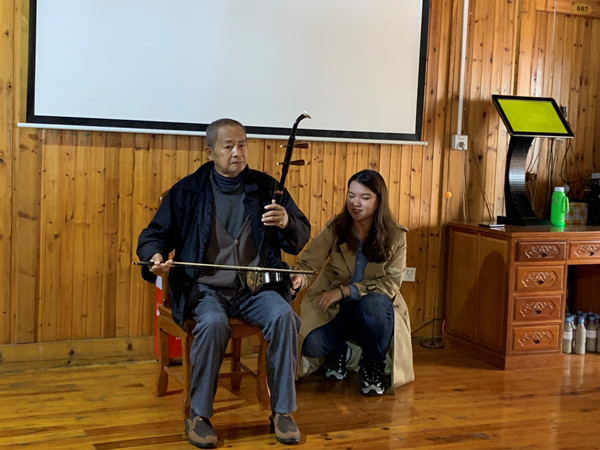 万盈对志愿者们讲述了注意事项,并进行了二胡、快板、歌唱等节目的彩排。到达目的地后,负责人和院长联系好,组织好老人到地点准备看志愿者节目。随后,安排所有志愿者进行自我介绍。开场节目为集体志愿者合唱“我和我的祖国”;第二个节目为二胡节目“赛马”,随即有老人积极上台表演二胡;第三个节目为志愿者跳街舞,街舞结束后,三位老人和三位志愿者跳交际舞;第四个节目为快板“鼠来宝”;最后一个节目为志愿者们合唱“常回家看看”。节目结束后,志愿者准备了剪纸、折纸、书法、象棋等活动,陪伴老人,陪老人聊聊天,听老人拉二胡。