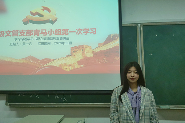 活动期间,黄一凡首先向小组成员介绍了此次学习活动的主要内容、学习目的及其重要性。随后,黄一凡结合文化产业管理专业相关特色着重强调习近平总书记相关文化产业理论,将文化和科技融合,既催生了新的文化业态、延伸了文化产业链,又聚集了大量创新人才,是朝阳产业。青马小组成员李妍发表观点,要在文化产业发展途中充分运用全息投影、虚拟现实等高科技技术,使红色资源转化为市场优势。最后,黄一凡总结湖南是一方红色热土,要教育引导广大党员、干部发扬革命传统,传承红色基因。要通过个人努力把湖南地方志通过现代互联网技术,变成通俗易懂的新媒体产品,让它在新时代发挥新作用。