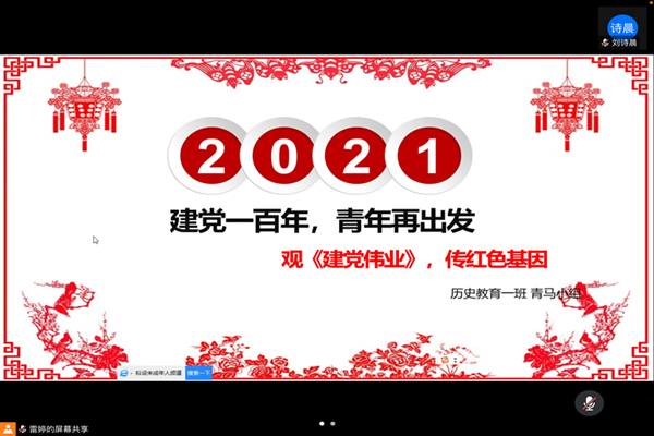 (通讯员 雷婷)3月19日下午,sunbet申搏2018级历史教育一班青马小组借助腾讯视频线上开展了第二次学习活动。此次学习活动由青马小组组员雷婷主持,以感受红色精神为出发点,以激励青年奋斗为落脚点,围绕“建党一百年,青年再出发”主题积极探索,旨在深化小组成员对党、对国家以及对自己人生的思考,提升青马小组成员的思想政治高度。
