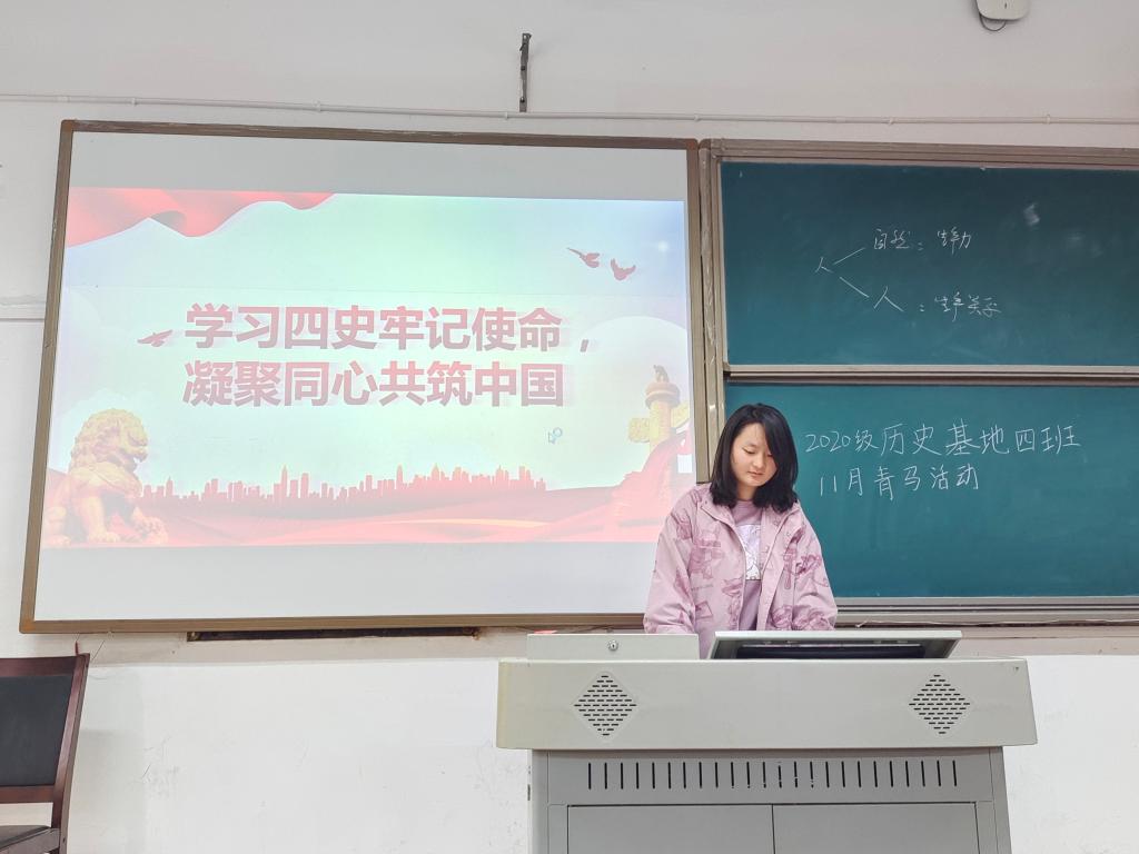 (通讯员 王可儿)为坚定理想信念,践行初心使命,11月16日中午,sunbet申搏2020级历史基地四班青马中心小组在历文院307教室开展了主题为“学习四史牢记使命,凝聚同心共筑中国”的学习交流会。本次活动由2020级历史基地四班青马中心小组组长王可儿主持,青马中心小组全体人员参加。